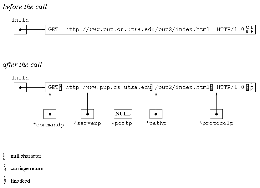 The example below shows a case in which there are two blanks after the GET and after the path and no blanks after the protocol. The first blank after the GET and path are replaced along with the carriage return. Note that if the optional carriage return had not been there, the line feed character would heave been replaced.