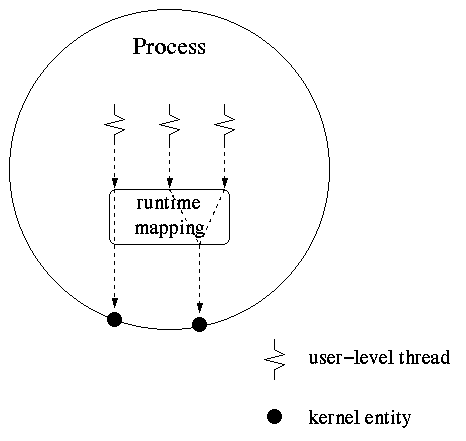 With a hybrid model, the threads of a process can share several kernel entities.