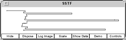 Find the Show Run Data Table button and click on it. Choose the SSTF entry. This will display a table similar to Figure 3, showing each individual seek in the order that the seek is started. For each seek, the starting and ending block number are shown. This is followed by the time the seek request arrived, the time is started and the time it completed. The turnaround time is shown next. This is the time between the request and the completion of the seek. Lastly, the size of the queue of pending requests at the time the request arrived is shown.