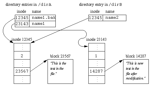 Figure 5.5 (page 165): Two hard links to the same file as in Figure 5.4. Figure 5.6 (page 167): The situation after editing the file. The original file had inode 12345 and two hard links prior to being edited.