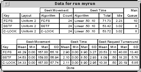 The lower table gives detailed statistics for each of the runs, giving the mean, minimum, maximum and sample standard deviation for three different statistical measures. Seek Movement refers to the number of cylinders moved. Seek Time is the time it takes to perform a seek using the seek time algorithm listed in the table above. The Seek Request Turnaround refers to the time between when a request comes in and the time the corresponding seek has completed.