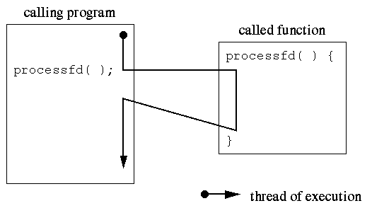 Figure 12.1 (page 412): Program that makes an ordinary call to processfd has a single thread of execution.