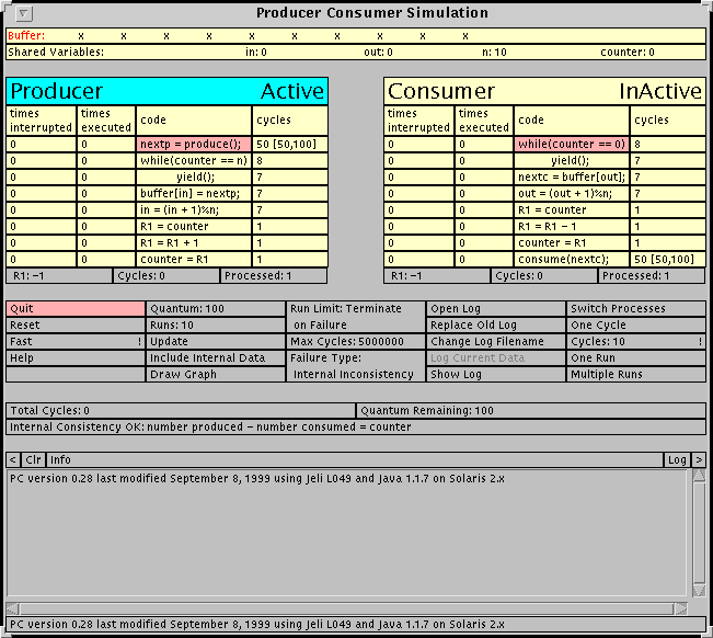 There are two types of protocol failure that can be used for stopping conditions. These are controlled by the last of the buttons in the middle column, and are called Internal Inconsistency and External Inconsistency. Internal Inconsistency refers to a problem which occurs when a critical section is interrupted and the shared variables are no longer consistent. For example, the counter may indicate one fewer or one greater number of items in the buffer than are actually there.