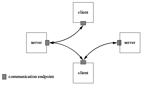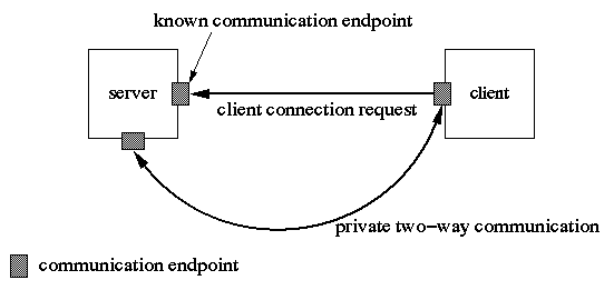 Figure 12.3 (page 434, modified): In a connection-oriented protocol, the server waits for a client request by monitoring a communication endpoint whose address is known to the clients. When a client request arrives, the server creates a new communication endpoint to handle two-way symmetric communication with the client.