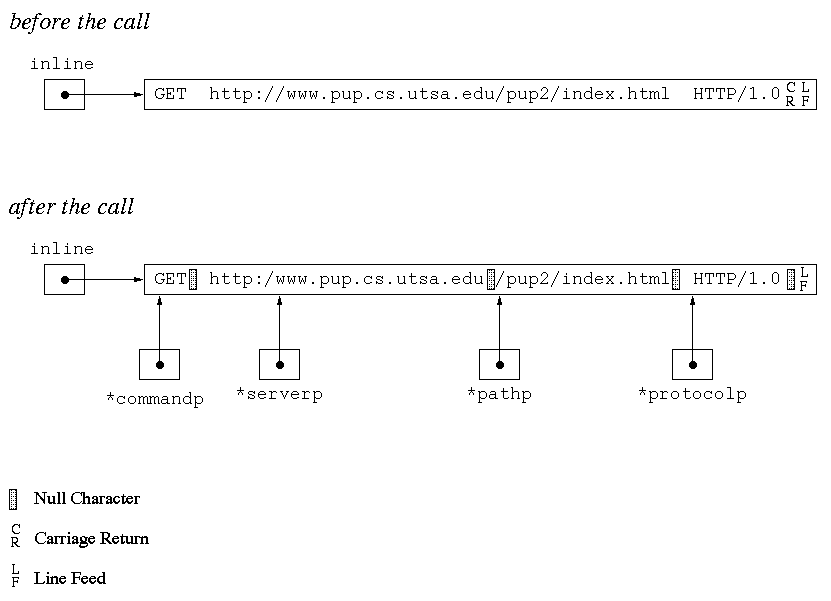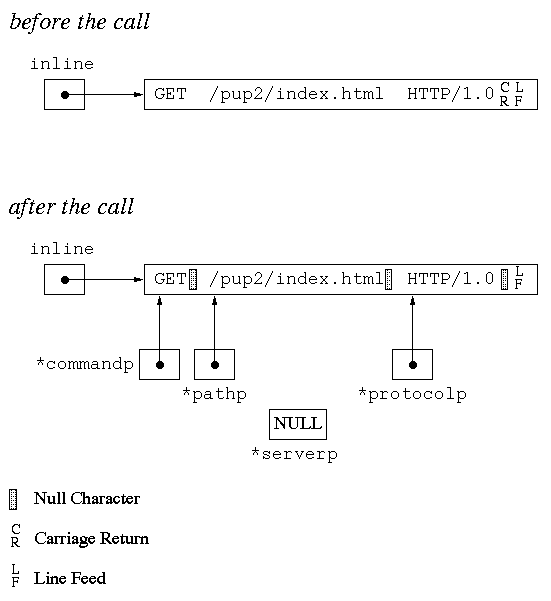The example below shows a case in which there are two blanks after the GET and after the path and no blanks after the protocol. The first blank after the GET and path are replaced along with the carriage return. Note that if the optional carriage return had not been there, the line feed character would heave been replaced.