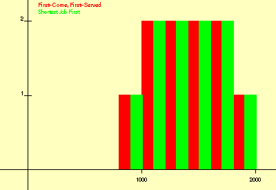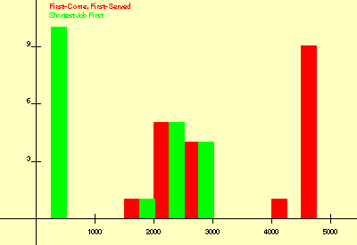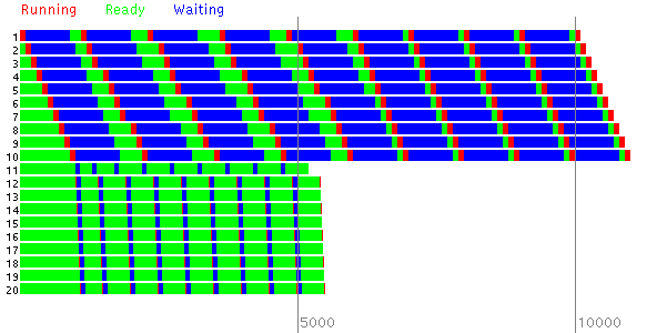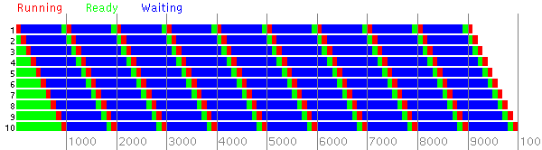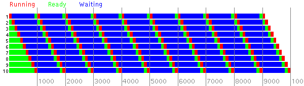 In this second experiment there are two sets of 10 processes. Each process in the first set executes 10 CPU bursts of length 100 and each process in the second set executes 10 CPU bursts of length 10.